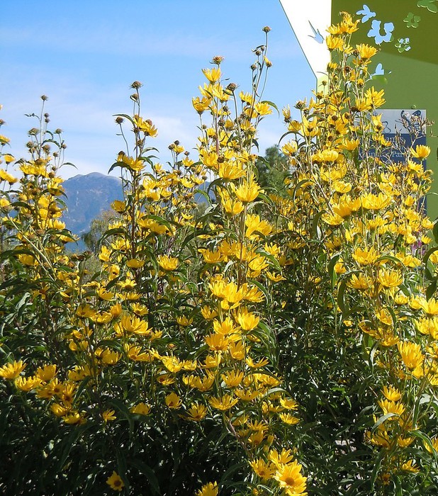 | Huge perennial sunflower. Available as seed. Thick hairy stems are difficult to penetrate and can be used used as a barrier. Excellent heat resistance, fast growth rate. |